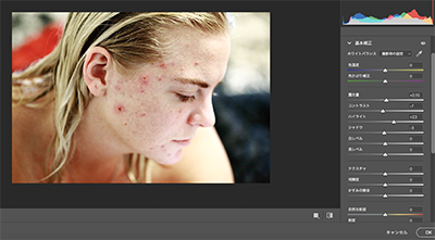 この写真では、ニキビの数が多く、肌が全体的に荒れているので、スポット修復ブラシツールだけで完成にはなりません。