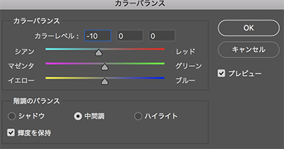 次に赤みの強い部分を[クイック選択ツール]で選択して、[イメージ]→[色調補正]→[カラーバランス]で赤みを消しましょう。